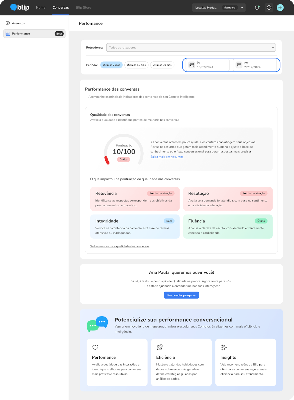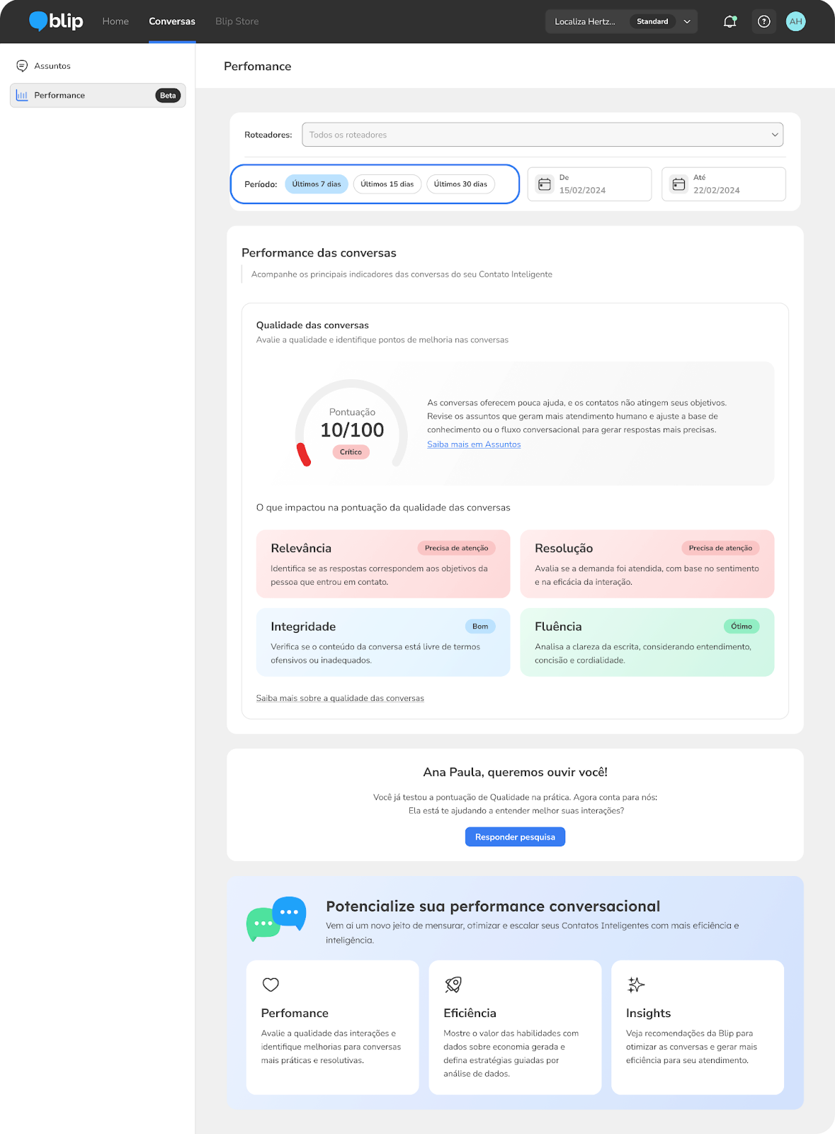 Qualidade de atendimento 17 de novembro de 2025 14:53 Atualizado Introdução No dia a dia, muitas empresas encontram um grande desafio: como saber se as conversas com seus clientes estão sendo realmente práticas e resolutivas? Com milhões de interações, é difícil entender o que está funcionando bem e onde é preciso melhorar. A falta de visibilidade sobre a qualidade das interações pode dificultar a identificação de onde agir para aprimorar a experiência do cliente e otimizar os fluxos conversacionais. Pensando nisso, a Blip desenvolveu um score de Qualidade das Conversas. Essa é uma métrica exclusiva que avalia as suas interações com base em critérios claros, práticos e com diferentes níveis de importância. A Qualidade das Conversas oferece um diagnóstico preciso sobre como as suas conversas estão se saindo, incentivando uma melhoria contínua na experiência dos seus usuários e fortalecendo a confiança na jornada automatizada. A análise da Qualidade das Conversas traz uma visão unificada, considerando o nível do contrato da marca (Workspace) ou pode ser realizada a partir de um conjunto de roteadores ou de forma individual. Isso permite que a marca tenha visibilidade da qualidade do Contato Inteligente como um todo, ou aprofunde a análise em pontos específicos da jornada do usuário por caso de uso. Por que a Qualidade das Conversas é Importante para seu Negócio? Investir na Qualidade das Conversas traz uma série de benefícios que impactam diretamente a satisfação dos seus clientes e a eficiência das suas operações: Melhore a experiência do usuário: Ao otimizar a qualidade das interações, garantimos que as necessidades dos seus usuários sejam atendidas de forma mais eficaz e agradável. Aumente a confiança: Conversas de alta qualidade, que são relevantes, seguras e precisas, constroem a confiança do seu usuário com o uso da automação. Otimize seus processos: A avaliação da qualidade das conversas permite identificar falhas no seu atendimento, como informações repetidas, falta de entendimento ou problemas na escrita. Assim, você pode fazer ajustes que tornam a jornada do seu usuário mais fluida e eficiente. Tome decisões com dados reais: Com a Qualidade das Conversas, você terá um diagnóstico claro e dados objetivos sobre o desempenho das suas conversas. Isso te ajuda a tomar decisões estratégicas para aprimorar continuamente o seu atendimento. Identifique oportunidades de melhoria: A análise detalhada dos critérios que compõem a qualidade da conversa (como Fluência, Integridade, Resolução e Relevância) revela exatamente onde você precisa focar seus esforços para otimizar suas interações. Em resumo, a Qualidade das Conversas te dá o controle de volta. Ela permite que você promova interações mais eficientes, satisfatórias e confiáveis, proporcionando uma experiência superior para o seu usuário e gerando resultados significativos para a sua marca. Como o score da qualidade das conversas é gerado Para que a Qualidade das Conversas seja uma ferramenta eficaz e confiável, é essencial entender como a sua pontuação é calculada. Nosso objetivo é oferecer um diagnóstico preciso que ajude você a aprimorar a experiência dos seus clientes. Critérios de avaliação A pontuação da Qualidade das Conversas é baseada em um conjunto de critérios cuidadosamente selecionados, que avaliam diferentes aspectos das interações. Cada critério possui um peso diferente, refletindo sua importância para a experiência geral: Fluência (Peso 1): Este critério identifica se a automação consegue dar sequência à conversa, sem interrupções. Ele verifica a presença de mensagens como "desculpe, não entendi" (fallbacks), repetições (redundâncias), erros de português ou inadequações na escrita que possam dificultar a compreensão. Subcritérios: Entendimento, Concisão e, Qualidade da Escrita. Integridade (Peso 2): Nesta versão inicial, este critério avalia a ausência de conteúdo ofensivo ou inadequado nas mensagens enviadas.Subcritérios: Não-toxicidade. Resolução (Peso 3): Este critério busca determinar se a interação foi capaz de resolver a necessidade do usuário. Para isso, analisamos o sentimento predominante expresso pelo usuário ao longo da conversa e a eficácia da interação, validando se o objetivo do usuário foi, de fato, cumprido.Subcritérios: Análise de Sentimento e Eficácia. Relevância (Peso 4): Este critério avalia se as mensagens enviadas foram aderentes à intenção ou aos motivos de contato do usuário na conversa.Subcritérios: Aderência. Como a pontuação é calculada A geração da pontuação da Qualidade das Conversas segue um processo estruturado: Avaliação dos subcritérios: Para cada conversa, nossos modelos de inteligência artificial avaliam individualmente os 8 subcritérios definidos (como Qualidade da Escrita, Entendimento, Não-toxicidade, Análise de Sentimento, Eficácia, Aderência e Concisão). Cada subcritério recebe uma nota de 1 (subcritério atendido), 0 (parcialmente atendido ou não se aplica) ou -1 (subcritério não atendido). Normalização das notas: Em critérios que possuem mais de um subcritério (como Fluência), as notas individuais são combinadas e normalizadas em uma única nota. Essa normalização garante que o peso de cada subcritério seja corretamente considerado no cálculo final do critério. Cálculo da pontuação final: Com as notas normalizadas de cada um dos quatro critérios principais (Fluência, Integridade, Resolução e Relevância), e considerando seus respectivos pesos, aplicamos uma função matemática (função Sigmoid) que transforma o resultado em um valor entre 0 e 100. Esse é o valor da sua Qualidade das Conversas. Pontuação geral Para facilitar a sua compreensão, a pontuação da Qualidade das Conversas é classificada em quatro níveis: Excelente: Pontuação entre 75 e 100 Bom: Pontuação entre 50 e 