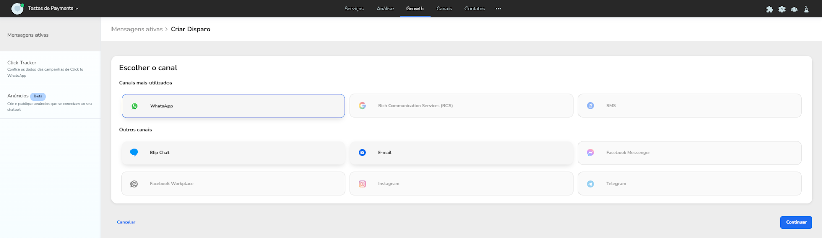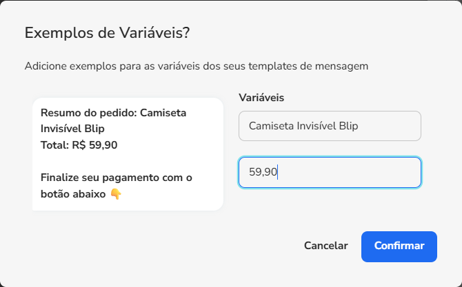 Como Criar e Enviar Mensagens Ativas de Pagamento no Blip 22 de janeiro de 2026 15:13 Atualizado Importante: este produto está em Alpha e não está disponível para uso geral. A liberação ocorre mediante solicitação via KAM, AM ou CSM, com validação do time de Payments.Canal disponível: WhatsApp Introdução: Mensagens Ativas de PagamentoAs Mensagens Ativas de Pagamento permitem que sua marca envie solicitações de pagamento diretamente pelo WhatsApp, de forma segura e integrada à experiência do cliente.Esse tipo de mensagem pode ser usado para lembrar o cliente de um pagamento pendente, enviar o resumo de um pedido ou até uma promoção personalizada para concluir uma compra. Tudo isso sem depender de o cliente iniciar a conversa.No Blip, esse processo pode ser configurado de forma inteligente, automatizada e estratégica. Criando o Modelo de Mensagem Ativa Acesse o portal da Blip e selecione um chatbot que possua um número de WhatsApp ativo. Clique nos “...” no canto superior e selecione o módulo Conteúdos. Dentro da aba, escolha Modelo de Mensagens e clique em “Criar modelo”. Uma caixa lateral será aberta para preencher as informações do modelo.O botão “Enviar para avaliação” só ficará disponível após o preenchimento completo de todos os campos.Campos para preenchimentoNome do modeloDefina o nome que identifica o template.Use apenas letras minúsculas, números ou o caractere underline (_) para separar palavras.Exemplo: cobranca_pedido CategoriaPara mensagens de pagamento, você deve selecionar a categoria Utilidade. Idioma do modeloSelecione o idioma Português (Brasil). Atualmente, o modelo de pagamentos via WhatsApp está disponível apenas para o Brasil e Índia. Portanto, não é possível criar variações em inglês ou outros idiomas para esta finalidade específica. Tipo de conteúdo da mensagemO Blip permite diferentes formatos de conteúdo.Mas nesse caso selecione o tipo Pagamentos. Este tipo específico habilita os campos necessários para o envio do objeto de order details (detalhes do pedido). Estrutura e Interatividade do TemplateDiferente dos templates comuns, as mensagens de pagamento possuem uma estrutura fixa voltada para transações.A estrutura permite: Cabeçalho: Escolha o tipo de mídia (Texto, Imagem, Documento ou Sem cabeçalho). Corpo da mensagem: Insira o texto da cobrança. Você pode usar variáveis (ex: {{1}}, {{2}}) para personalizar o nome do cliente, número do pedido ou valor no texto visível. Rodapé: Um texto curto e fixo ao final da mensagem. Importante: O método de pagamento (Pix, Boleto, Cartão) não é definido nesta etapa de criação do template. Ele será configurado no arquivo de audiência (JSON) no momento do envio. Envio para avaliaçãoApós preencher os campos e definir as variáveis do corpo da mensagem, clique em “Enviar para avaliação”.Será exibido um modal solicitando exemplos para as variáveis. Preencha com dados fictícios que façam sentido (ex: {{1}} = Maria, {{2}} = 150,00) para que a Meta entenda o contexto.Importante: Evite começar ou terminar o corpo da mensagem com uma variável (ex: {{1}}). O WhatsApp exige que cada variável esteja acompanhada de texto fixo antes e/ou depois, como em “Olá {{1}}, seu pedido foi enviado.” Isso ajuda o sistema a validar corretamente o conteúdo dinâmico.Ao concluir o preenchimento, clique em “Confirmar” para finalizar o envio do modelo para análise conforme o exemplo abaixo:Analisando o status do Message TemplateDepois de enviar o seu modelo para avaliação, ele aparecerá na lista com o status “Pendente”, indicando que está em análise pela Meta.Assim que o processo de revisão for concluído, o modelo receberá um dos seguintes status: Aprovado: o template foi aceito e já pode ser utilizado nas suas campanhas. Reprovado: o template foi rejeitado e não poderá ser usado. Pendente: o template ainda está em análise pela Meta. Atenção: mesmo após a aprovação, a atualização pode levar até 20 minutos para ser refletida na WhatsApp Business API.Recomendamos que aguarde esse tempo antes de iniciar o envio da sua campanha. Como enviar uma Mensagem ativa de Pagamentos via GrowthVocê pode realizar o envio das mensagens de pagamento de duas formas: Via API: Para integrações sistêmicas. Consulte a documentação técnica aqui. Via Portal (Growth): Através de disparos em massa, conforme o passo a passo abaixo. Configurando o Disparo no GrowthNo portal do Blip, acesse o menu Growth → Mensagens ativas. Clique em "Enviar mensagens ativas".A nova interface de disparo agrupa as configurações em uma tela unificada para facilitar o processo. Preencha as seções conforme a seguir:1. Seleção do CanalEscolha o canal WhatsApp.2. Definição da CampanhaDefina um nome para sua campanha para facilitar a identificação nos relatórios futuros.Caso o nome da mensagem não seja definido, ao clicar no botão “Continuar” será apresentada uma mensagem informando que não foi definido um nome e apresentando as seguintes opções: Cancelar ou, Continuar sem nome Se a opção de continuar sem nome for escolhida, então um nome aleatório será definido para a mensagem.3. Audiência (Obrigatório: Em Massa)Para mensagens de pagamento, só é possível realizar o envio do tipo "Em massa". Opções como "Envio Individual" ou "Agente de IA" não suportam a estrutura de dados complexa (JSON) exigida para pagamentos.Você precisará carregar um arquivo .csv contendo os dados dos clientes e as informações do pagamento. Arquivo de audiência para PagamentosPara enviar uma mensagem de pagamentos, é preciso seguir alguns padrões específicos do arquivo de audiência, são eles: Usar o delimitador ponto-e-vírgula (;) no arquivo; Ter as colunas referente ao template (cabeçalho e variáveis do corpo da mensagem); Finalizar com a coluna #payment#. A coluna #payment# deve conter o objeto JSON específico da mensagem tipo “order_details