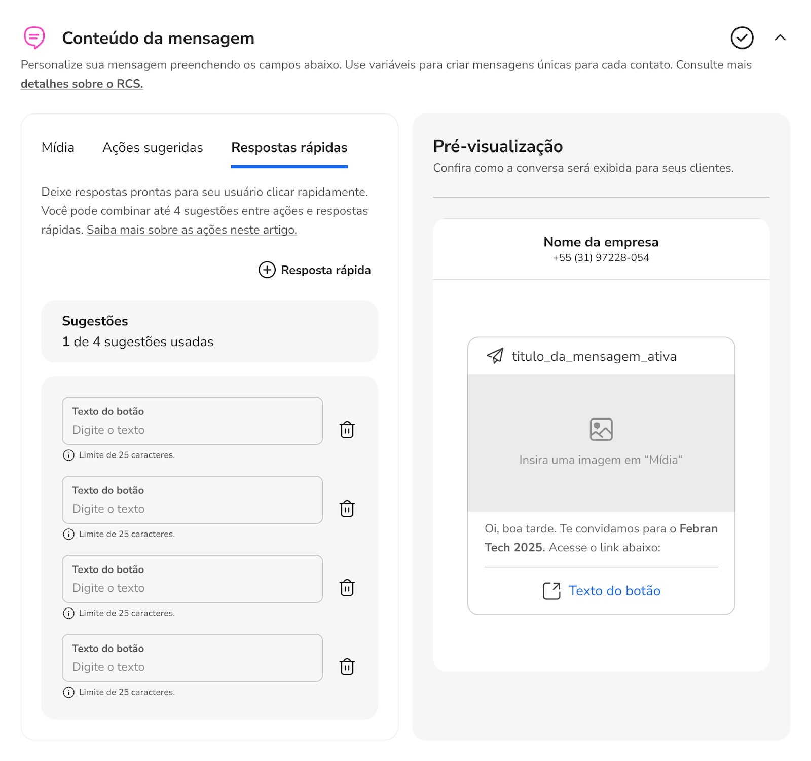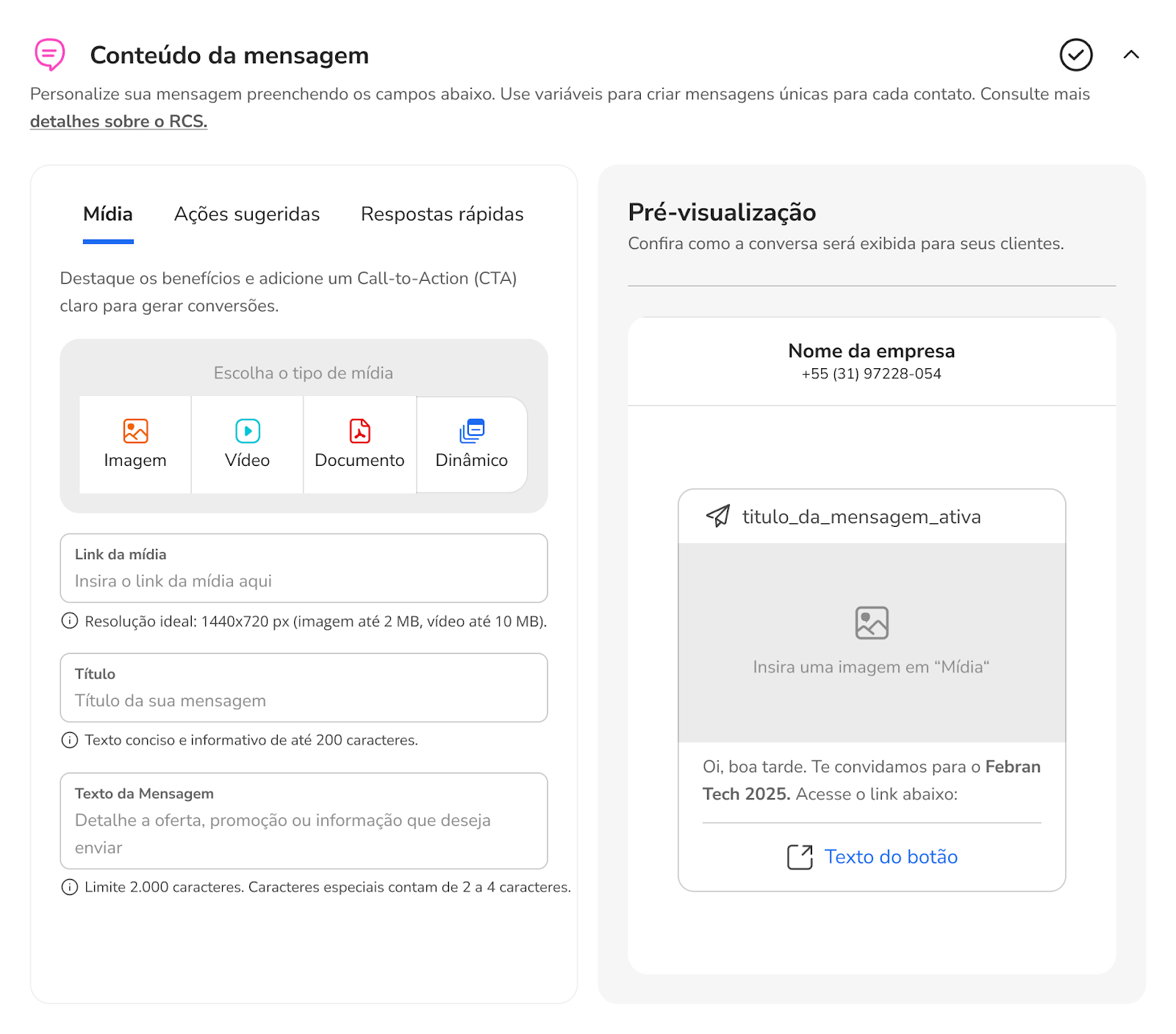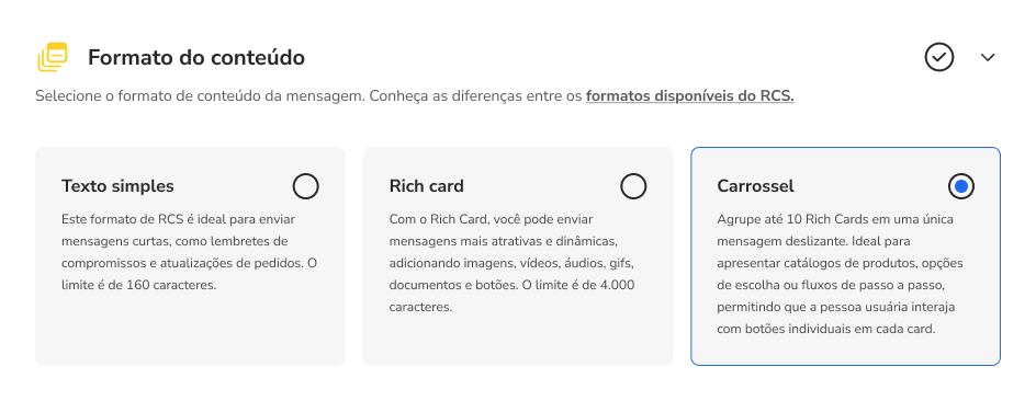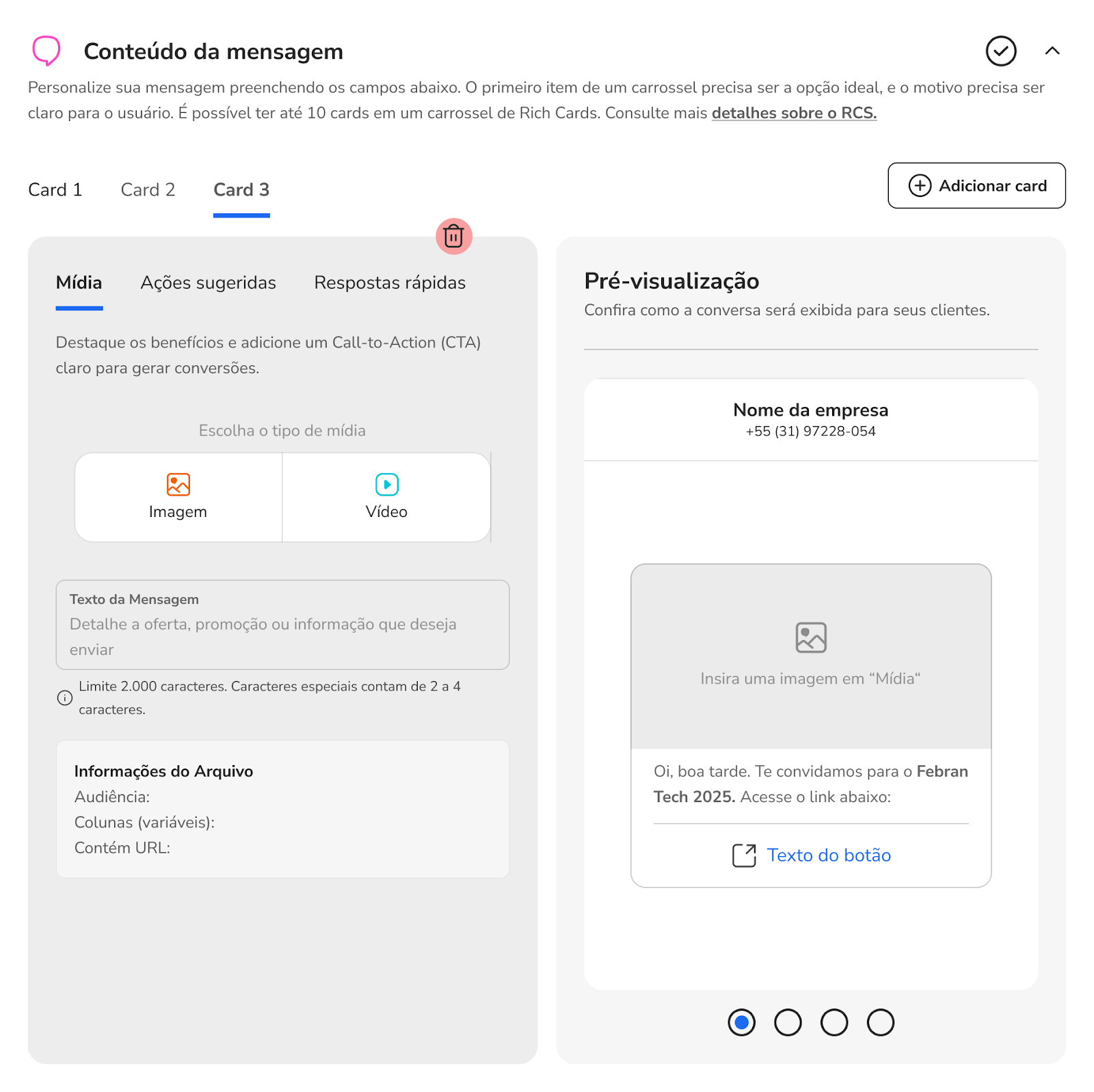 Como enviar mensagens ativas com Rich Card via RCS 20 de janeiro de 2026 17:03 Atualizado Índice O que é Rich Card? Passa a passo para envio de mensagem ativa com RCS - via Portal O que é Rich Card?Com os Rich Cards, é possível enviar um conjunto de informações, mídia ou sugestões relacionadas como uma única unidade. Você pode enviar cards avançados individualmente ou em um carrossel. Eles podem conter mídia, texto de título, texto de descrição, respostas sugeridas e ações sugeridas.Um Rich Card pode conter o seguinte: Mídia (imagem/GIF, vídeo ou arquivo) Texto do título Texto da descrição Respostas e ações sugeridas. Passa a passo para envio de mensagem ativa com RCS - via Portal1. Selecione o canal RCS e clique no botão “Continuar”2. Ao aparecer o pop-up de Novidade!, clique no botão “Continuar”.3. Na próxima tela, você terá uma única página com todo o fluxo para configurar sua nova mensagem a ser disparada. No canto superior direito, selecione o “Tipo de disparo”. Individual: Mensagem a ser enviada especificamente para um único contato. Em massa: Mensagem a ser enviada para um grupo de contatos. 4. Se selecionado a opção “Em massa”, adicione a planilha no formato .csv com todos os contatos que receberão a mensagem.4.1. Se selecionado a opção “Individual”, insira obrigatoriamente o telefone do contato e, se desejar, o nome do destinatário.5. Na próxima seção, selecione o formato de conteúdo da mensagem.Texto simples: somente texto, até 160 caracteres, igual um SMS.Rich card: conteúdo rico, imagens, botões, carrossel, etc.Carrossel: agrupamento de até 10 Rich Cards em uma única mensagem deslizante. Texto simples6. As mensagens mais simples são feitas de texto. As mensagens de texto são mais adequadas para comunicar informações sem a necessidade de recursos visuais, interação complexa ou resposta.Uma mensagem do RBM (Rich Business Messaging) com até 160 caracteres UTF-8 é chamada de mensagem básica. Ao enviar uma mensagem básica, lembre-se de que os caracteres são contados como 1 byte (UTF-8). Se você enviar uma mensagem com caracteres especiais, como emojis ou um conjunto de caracteres multibyte, cada caractere vai contar como 2 a 4 caracteres UTF-8 ou mais. Rich Card7. Caso selecione “Rich card”, os formatos de “Mídia”, “Ações sugeridas” e “Respostas rápidas” serão apresentados.Você poderá criar sua mensagem com “Mídia”, suportando os formatos de imagem, vídeo, documento ou dinâmico.Os Rich Cards podem incluir várias mídias, como imagens, GIFs, vídeos e arquivos PDF. Os Rich Cards são compatíveis com vários formatos de mídia. Tipos de imagens compatíveis: JPEG/JPG GIF PNG Tipos de vídeo compatíveis: H.263 M4V MP4 MPEG MPEG-4 WebM Tipos de arquivo compatíveis:PDFConteúdo dinâmico:Formato json 7.1. Ou criar sua mensagem com “Ações sugeridas”, sendo as ações como fazer uma ligação ou abrir um link;As ações sugeridas facilitam a ligação para o suporte ao cliente ou direcionar o cliente ao site. Você pode adicionar até 04 ações contendo até 25 caracteres cada. 7.2: Ou criar “Respostas rápidas”, inserindo até 04 botões.As Respostas Rápidas ajudam os usuários a interagir de maneiras que ele pode responder facilmente. A menos que a interação exija uma resposta livre, use respostas sugeridas. Eles são mais fáceis de processar do que texto livre e permitem que conduza as conversas por um caminho ideal. Você pode adicionar até 04 respostas contendo até 25 caracteres cada. Carrossel8. Caso selecione a opção “Carrossel”, você pode enviar uma mensagem com um agrupamento de Rich Cards.Os carrosséis de Rich Cards são ideais para mostrar vários itens, como planos de dados ou dispositivos, permitindo que os usuários naveguem e compare diferentes opções em uma única mensagem. Um carrossel é ideal quando você quer apresentar uma variedade de opções ou permitir a exploração de conteúdo relacionado.Assim como em uma mensagem de Rich Card independente, você pode incluir ícones de sugestão abaixo de um carrossel para avançar a conversa, além de mídias, como imagens e vídeos. No formato de carrossel, não é permitido o envio de documentos, como PDF. Os carrosséis podem conter de dois a dez Rich Cards.9. Em seguida, selecione o encaminhamento do disparo para um contato inteligente, ou contato inteligente com IA ou para atendimento humano.Contato Inteligente: direcionar a um evento específico de um determinado contato inteligente. Contato Inteligente com IA: direcionar a um específico Agente de IA para atendimento. Atendimento Humano: direcionar a mensagem para um atendente específico.10. Na última seção, configure os ajustes do disparo de acordo com suas necessidades. Crie um nome para identificação e insira tags personalizadas. Caso não insira um nome específico, será criado um aleatoriamente.Por fim, selecione o “Tipo de envio”. Você pode disparar a mensagem naquele exato momento (“Enviar agora”) ou programar o envio para uma determinada data e hora (“Agendar envio”). Para concluir, clique no botão “Enviar”. LimitesOs títulos dos Rich Cards são limitados a 200 caracteres, enquanto as descrições podem ter até 2.000 caracteres. Não se esqueça de que caracteres especiais, como emojis ou um conjunto de caracteres multibyte, contam como 2 a 4 caracteres ou mais.O tamanho máximo de um payload de Rich Card é de 250 KB. Para mais informações, acesse a discussão sobre o assunto em nossa comunidade ou os vídeos no nosso canal. 😃 Artigos relacionados Como publicar o Google RCS no seu Chatbot Dúvidas sobre modelos de mensagens no WhatsApp Resumo - Imprensa Descrições de título de dashboard e Divisor de seção - STILINGUE Studio Guia Técnico: Como buscar um PDF via API e exibir no Chatbot