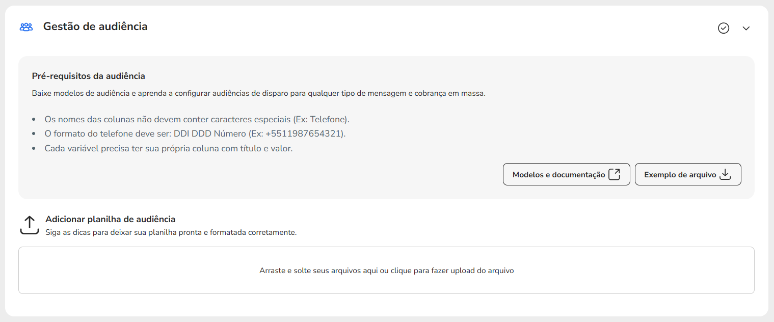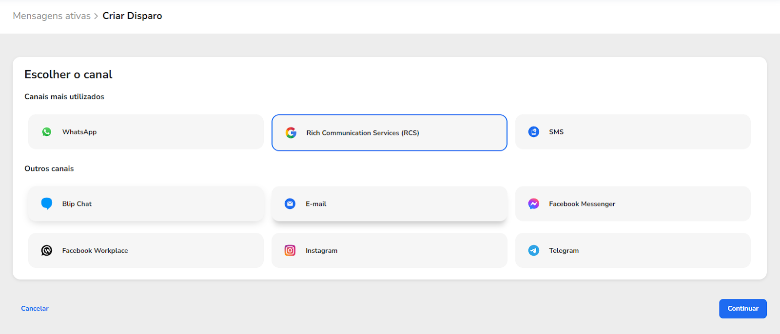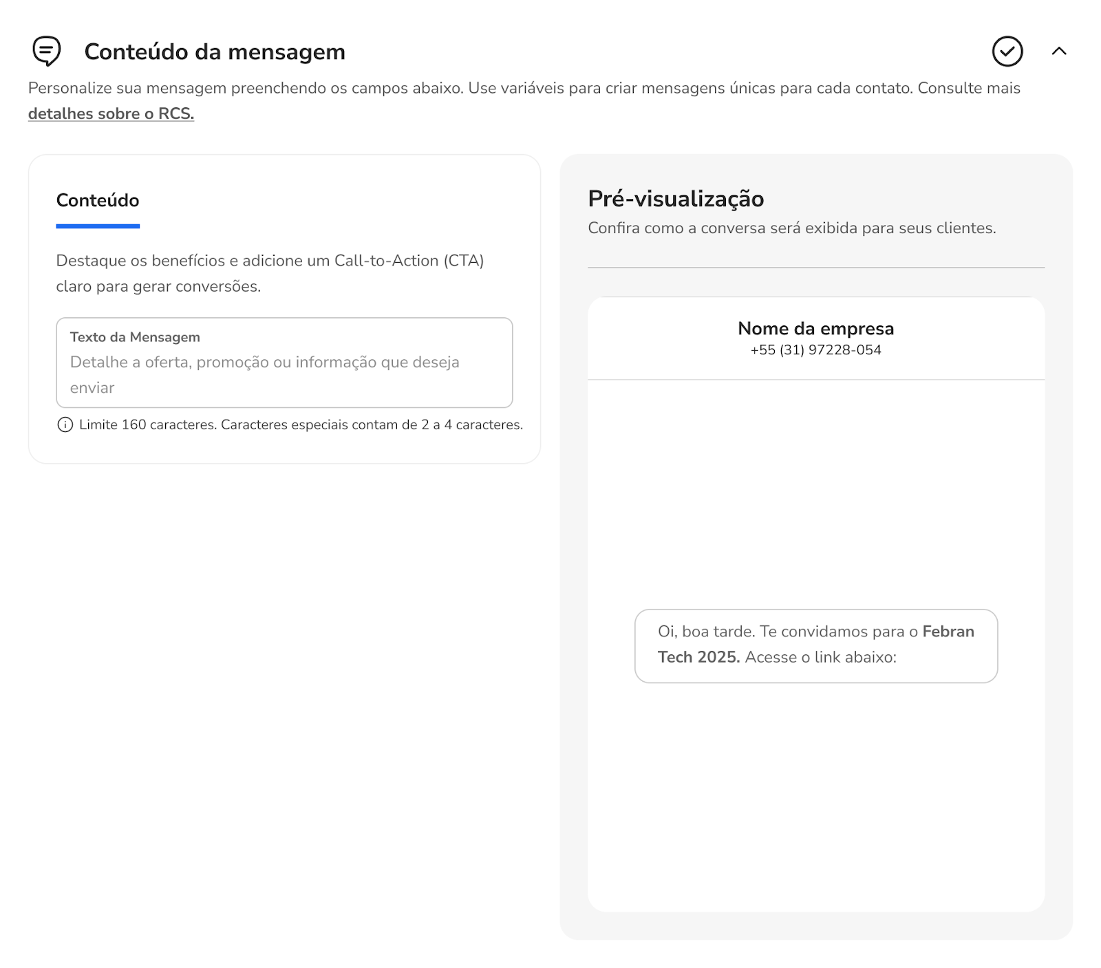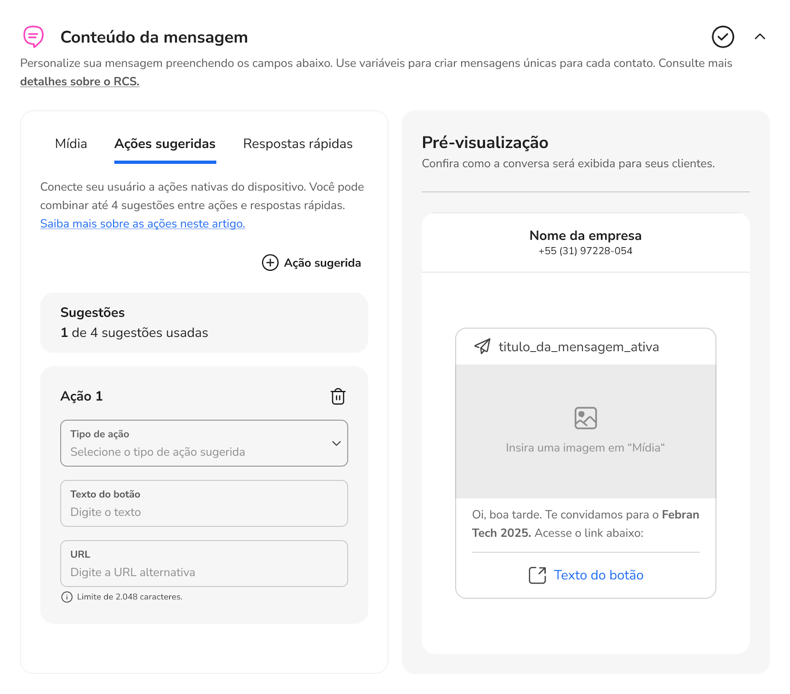 Como enviar mensagens ativas com Rich Card via RCS 20 de janeiro de 2026 17:03 Atualizado Índice O que é Rich Card? Passa a passo para envio de mensagem ativa com RCS - via Portal O que é Rich Card?Com os Rich Cards, é possível enviar um conjunto de informações, mídia ou sugestões relacionadas como uma única unidade. Você pode enviar cards avançados individualmente ou em um carrossel. Eles podem conter mídia, texto de título, texto de descrição, respostas sugeridas e ações sugeridas.Um Rich Card pode conter o seguinte: Mídia (imagem/GIF, vídeo ou arquivo) Texto do título Texto da descrição Respostas e ações sugeridas. Passa a passo para envio de mensagem ativa com RCS - via Portal1. Selecione o canal RCS e clique no botão “Continuar”2. Ao aparecer o pop-up de Novidade!, clique no botão “Continuar”.3. Na próxima tela, você terá uma única página com todo o fluxo para configurar sua nova mensagem a ser disparada. No canto superior direito, selecione o “Tipo de disparo”. Individual: Mensagem a ser enviada especificamente para um único contato. Em massa: Mensagem a ser enviada para um grupo de contatos. 4. Se selecionado a opção “Em massa”, adicione a planilha no formato .csv com todos os contatos que receberão a mensagem.4.1. Se selecionado a opção “Individual”, insira obrigatoriamente o telefone do contato e, se desejar, o nome do destinatário.5. Na próxima seção, selecione o formato de conteúdo da mensagem.Texto simples: somente texto, até 160 caracteres, igual um SMS.Rich card: conteúdo rico, imagens, botões, carrossel, etc.Carrossel: agrupamento de até 10 Rich Cards em uma única mensagem deslizante. Texto simples6. As mensagens mais simples são feitas de texto. As mensagens de texto são mais adequadas para comunicar informações sem a necessidade de recursos visuais, interação complexa ou resposta.Uma mensagem do RBM (Rich Business Messaging) com até 160 caracteres UTF-8 é chamada de mensagem básica. Ao enviar uma mensagem básica, lembre-se de que os caracteres são contados como 1 byte (UTF-8). Se você enviar uma mensagem com caracteres especiais, como emojis ou um conjunto de caracteres multibyte, cada caractere vai contar como 2 a 4 caracteres UTF-8 ou mais. Rich Card7. Caso selecione “Rich card”, os formatos de “Mídia”, “Ações sugeridas” e “Respostas rápidas” serão apresentados.Você poderá criar sua mensagem com “Mídia”, suportando os formatos de imagem, vídeo, documento ou dinâmico.Os Rich Cards podem incluir várias mídias, como imagens, GIFs, vídeos e arquivos PDF. Os Rich Cards são compatíveis com vários formatos de mídia. Tipos de imagens compatíveis: JPEG/JPG GIF PNG Tipos de vídeo compatíveis: H.263 M4V MP4 MPEG MPEG-4 WebM Tipos de arquivo compatíveis:PDFConteúdo dinâmico:Formato json 7.1. Ou criar sua mensagem com “Ações sugeridas”, sendo as ações como fazer uma ligação ou abrir um link;As ações sugeridas facilitam a ligação para o suporte ao cliente ou direcionar o cliente ao site. Você pode adicionar até 04 ações contendo até 25 caracteres cada. 7.2: Ou criar “Respostas rápidas”, inserindo até 04 botões.As Respostas Rápidas ajudam os usuários a interagir de maneiras que ele pode responder facilmente. A menos que a interação exija uma resposta livre, use respostas sugeridas. Eles são mais fáceis de processar do que texto livre e permitem que conduza as conversas por um caminho ideal. Você pode adicionar até 04 respostas contendo até 25 caracteres cada. Carrossel8. Caso selecione a opção “Carrossel”, você pode enviar uma mensagem com um agrupamento de Rich Cards.Os carrosséis de Rich Cards são ideais para mostrar vários itens, como planos de dados ou dispositivos, permitindo que os usuários naveguem e compare diferentes opções em uma única mensagem. Um carrossel é ideal quando você quer apresentar uma variedade de opções ou permitir a exploração de conteúdo relacionado.Assim como em uma mensagem de Rich Card independente, você pode incluir ícones de sugestão abaixo de um carrossel para avançar a conversa, além de mídias, como imagens e vídeos. No formato de carrossel, não é permitido o envio de documentos, como PDF. Os carrosséis podem conter de dois a dez Rich Cards.9. Em seguida, selecione o encaminhamento do disparo para um contato inteligente, ou contato inteligente com IA ou para atendimento humano.Contato Inteligente: direcionar a um evento específico de um determinado contato inteligente. Contato Inteligente com IA: direcionar a um específico Agente de IA para atendimento. Atendimento Humano: direcionar a mensagem para um atendente específico.10. Na última seção, configure os ajustes do disparo de acordo com suas necessidades. Crie um nome para identificação e insira tags personalizadas. Caso não insira um nome específico, será criado um aleatoriamente.Por fim, selecione o “Tipo de envio”. Você pode disparar a mensagem naquele exato momento (“Enviar agora”) ou programar o envio para uma determinada data e hora (“Agendar envio”). Para concluir, clique no botão “Enviar”. LimitesOs títulos dos Rich Cards são limitados a 200 caracteres, enquanto as descrições podem ter até 2.000 caracteres. Não se esqueça de que caracteres especiais, como emojis ou um conjunto de caracteres multibyte, contam como 2 a 4 caracteres ou mais.O tamanho máximo de um payload de Rich Card é de 250 KB. Para mais informações, acesse a discussão sobre o assunto em nossa comunidade ou os vídeos no nosso canal. 😃 Artigos relacionados Como publicar o Google RCS no seu Chatbot Dúvidas sobre modelos de mensagens no WhatsApp Resumo - Imprensa Descrições de título de dashboard e Divisor de seção - STILINGUE Studio Guia Técnico: Como buscar um PDF via API e exibir no Chatbot