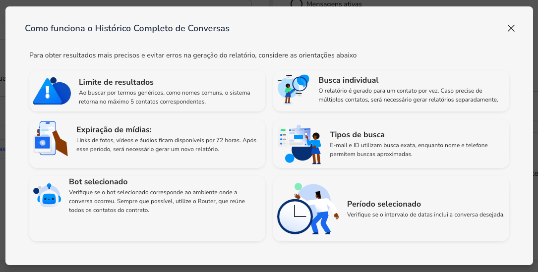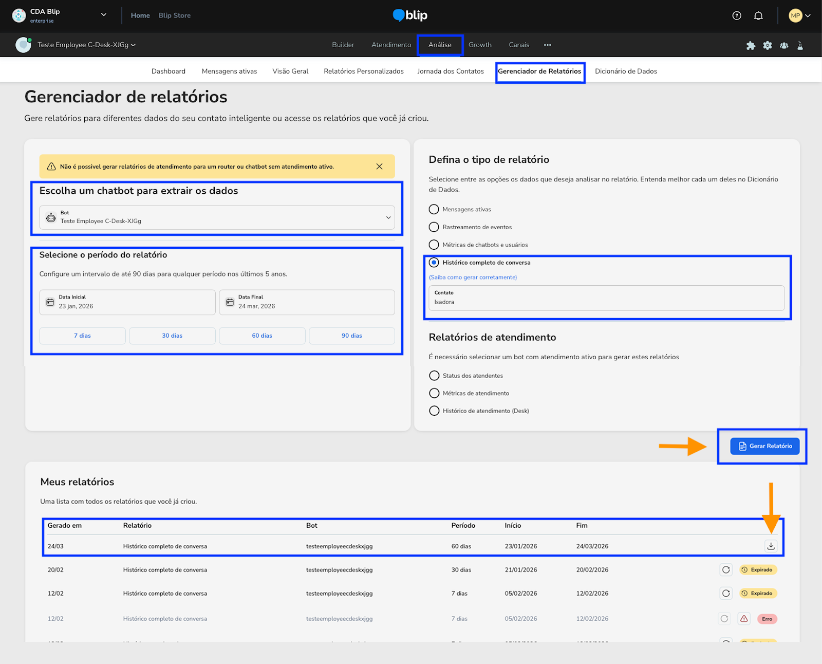 Como gerar o histórico completo de conversas 26 de março de 2026 18:11 Atualizado Índice Introdução Para que serve o relatório Permissões necessárias Como exportar o relatório Regras do sistema Entendendo as mensagens do sistema IntroduçãoAprenda a extrair um relatório consolidado com todas as interações de um contato, unindo as conversas do chatbot e do atendimento humano em um único PDF.Para que serve o relatórioEste recurso permite visualizar toda a jornada de um cliente com a sua marca. Ele é ideal para: Auditorias e Compliance: atender solicitações jurídicas ou de LGPD com rapidez. Análise de Qualidade: avaliar o histórico completo de um atendimento específico. Gestão de Relacionamento: O sistema consolida todas as conversas encontradas para o contato informado. Permissões necessáriasPara visualizar e gerar este relatório, você precisa ter o nível de permissão de Visualizar ou Ver e editar no módulo de Análise. Caso não visualize a opção, entre em contato com a pessoa administradora da sua conta.Como exportar o relatório No menu principal do Blip, acesse o Análise. A seguir, acesse no menu o Gerenciador de Relatórios. Escolha o período desejado para a extração. Selecione a opção Histórico completo de conversa. No campo de busca, informe o nome, e-mail, telefone ou ID do contato. (Nome e telefone devem ser informados de forma específica para evitar múltiplos resultados. E-mail e ID utilizam busca exata.) Caso tenha dúvidas sobre como preencher o campo de busca para encontrar o contato correto, você pode consultar o modal de ajuda disponível na própria interface. Ele traz orientações para tornar a busca mais precisa e aumentar as chances de gerar o histórico completo da conversa. Clique em Gerar relatório. O arquivo será processado e disponibilizado para download em PDF na lista abaixo. Regras do sistemaPara garantir a melhor performance, observe as seguintes condições: Limite de resultados: ao buscar por termos genéricos (como "Paulo"), o sistema retornará até 5 contatos correspondentes. Seja específico na busca para encontrar o contato exato. Busca individual: o relatório é gerado para apenas um contato por vez. Expiração de mídias: links para fotos, vídeos e áudios dentro do PDF ficam disponíveis por apenas 72 horas. Após esse período, os links expiram. Tipos de busca: e-mail e ID utilizam busca exata, enquanto nome e telefone permitem buscas aproximadas. Disponibilidade do relatório para download: O relatório permite a consulta e o download de conversas ocorridas nos últimos 90 dias. Entendendo as mensagens do sistemaDurante o uso, você poderá encontrar as seguintes mensagens e avisos:Avisos de Processamento e Sucesso “O histórico está sendo processado e em breve estará disponível”: indica que o Blip está reunindo os dados. Como o histórico pode ser longo, o sistema precisa de alguns segundos para gerar o PDF. “Baixar histórico completo do contato”: este é o botão que aparece assim que o processamento termina. Clique nele para salvar o arquivo em seu computador. Mensagens de Erro e Validação “O contato não foi encontrado no período”: indica que não localizamos conversas com os dados informados no intervalo de datas selecionado. Verifique se o período está correto ou se o contato interagiu com este bot específico. “Resultados em excesso. Por favor, refine sua busca para uma identificação mais exata do contato”: aparece quando a busca retornou muitos nomes parecidos. Para resolver, tente informar dados mais específicos, como o e-mail ou o ID do contato. “O histórico completo da conversa expirou. Gere novamente para obter os dados: por segurança e para economizar espaço, o link de download não é permanente. Se você vir esta mensagem, basta realizar a busca e clicar em gerar relatório novamente. “Nenhum contato foi encontrado. Confira os filtros aplicados e tente novamente”: os dados informados (nome, e-mail, etc.) não correspondem a nenhum contato na base, nesse caso você pode tentar mudar o Bot ou Router selecionado também. “Nenhuma conversa foi encontrada. Confira os filtros aplicados e tente novamente”: o contato foi localizado, mas não existem interações registradas no período selecionado. “Tempo máximo de processamento excedido”: o volume de dados para este contato é muito grande e o sistema não conseguiu finalizar a tempo. Tente reduzir o intervalo de datas selecionado. “Ocorreu um erro durante o processamento”: algo não saiu como esperado no sistema. Tente novamente em alguns instantes. Dicas contextuais (Tooltips)Quando ocorrer um erro no processamento, você poderá clicar no botão com ícone de alerta exibido na tabela para abrir o modal de erro e entender com mais detalhes o que aconteceu. Para mais informações, acesse a discussão sobre o assunto em nossa comunidade ou os vídeos no nosso canal. 😃 Artigos relacionados Gerenciador de relatórios Envio de Mensagens Ativas do WhatsApp no Blip Desk Dashboard - Filtro de Data & Indicador de Comparação O que é o Dashboard? Como realizar o reset de usuários pelo Beholder?