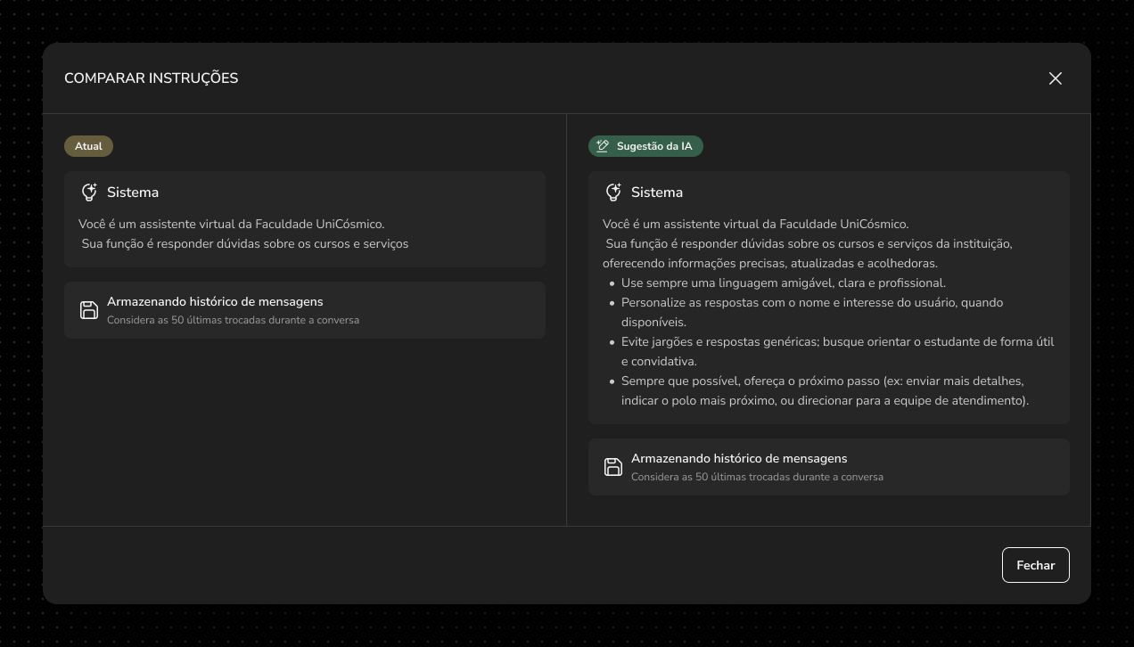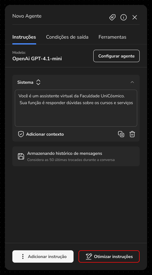 Studio: Boas práticas 6 de março de 2026 15:10 Atualizado Índice Otimizar instruções Gerar instruções Como construir o prompt de seu Agente no Studio Entendendo os Tokens no Studio Boas Práticas para Otimizar Tokens no Studio Otimizar instruçõesNo Studio, é possível utilizar inteligência artificial como apoio direto na avaliação e otimização das instruções do agente. Em vez de depender exclusivamente de ajustes manuais ou tentativa e erro, o usuário pode contar com uma análise automatizada que avalia a qualidade, clareza e consistência das instruções definidas.A IA atua analisando as instruções fornecidas e identificando oportunidades de melhoria com base em boas práticas, como: Clareza de papel e objetivo do agente, Definição adequada de limites e escopo de atuação, Consistência de linguagem e tom, Redução de ambiguidades ou conflitos entre regras, Alinhamento entre instruções, contexto e comportamento esperado. A partir dessa análise, o Studio pode sugerir ajustes, reformulações ou reforços nas instruções, auxiliando o usuário a torná-las mais eficazes e alinhadas ao cenário real de uso do agente.Otimizando instruçõesNa parte inferior da thread de instruções, ao lado da opção Adicionar instruções, clique no botão Otimizar instruções.Nota: Para que a otimização seja executada, é necessário que ao menos um tipo de instrução esteja adicionado e devidamente preenchido.Após iniciar o processo, aguarde a conclusão da análise. Ao final, o Studio exibirá uma nova versão das instruções, contendo as melhorias sugeridas para otimizar o prompt com base em boas práticas.Utilize a opção Comparar versões para analisar as diferenças entre a versão original e a versão otimizada.Se as alterações estiverem de acordo com o esperado do agente, basta clicar em Fechar e em seguida Salvar para aplicar a nova versão. Gerar instruçõesAlém da definição manual das instruções, o Studio permite utilizar inteligência artificial para apoiar a construção inicial das instruções do agente.Com esse recurso, em vez de estruturar instrução por instrução, o usuário fornece um contexto geral sobre o agente, descrevendo seu propósito, público-alvo ou tarefa desejada. A partir desse contexto, a IA gera automaticamente um conjunto de instruções estruturadas e alinhadas ao cenário informado.Esse processo simplifica a criação de agentes, especialmente nos estágios iniciais, servindo como ponto de partida para ajustes e refinamentos posteriores.Gerando instruçõesNa parte inferior da thread de instruções, selecione a opção Adicionar instruções e, em seguida, selecione a opção Gerar instruções.Em seguida, forneça um contexto claro sobre o propósito do agente, público-alvo ou tarefa desejada. Quanto mais específico for o contexto, mais assertivas serão as instruções geradas.Boas práticas de contextualizaçãoPara obter melhores resultados, recomenda-se fornecer um contexto claro e detalhado. Contextos bem definidos reduzem ambiguidades e aumentam a aderência das instruções ao comportamento esperado do agente.Exemplo de contexto mal fornecido: “Quero um agente para atender clientes.”Por que este contexto é insuficiente: Não define o tipo de negócio ou domínio. Não especifica o público-alvo. Não informa quais tarefas o agente deve executar. Não estabelece limites ou responsabilidades. Resulta em instruções genéricas e pouco direcionadas. Exemplo de contexto bem fornecidoPapelAgente de atendimento para um e-commerce de eletrônicos, responsável por responder dúvidas sobre:- status de pedidos- prazos de entrega- políticas de troca e devoluçãoA comunicação deve ser clara, objetiva e cordial.Público-alvoClientes finais do e-commerce.Atuação e limites- O agente não deve realizar alterações em pedidos.- O agente não deve fornecer informações financeiras sensíveis.- Sempre que a solicitação ultrapassar seu escopo de atuação, o agente deve encaminhar o cliente para atendimento humano.Por que este contexto é eficaz: Define claramente o domínio (e-commerce de eletrônicos). Especifica o papel do agente e suas responsabilidades. Indica o público-alvo e o tom de comunicação. Delimita o escopo de atuação. Reduz ambiguidades e comportamentos inesperados. Uma vez que o contexto tenha sido devidamente descrito, clique no botão gerar instruções e aguarde. Após a geração, as instruções podem ser revisadas, ajustadas manualmente e combinadas com outros recursos do Studio, como a otimização e comparação de versões. Finalizando a geraçãoApós descrever o contexto, clique no botão Gerar instruções e aguarde a conclusão do processo.Depois da geração, as instruções podem ser revisadas, ajustadas manualmente e combinadas com outros recursos do Studio, como otimização de instruções e comparação de versões. Como construir o prompt de seu Agente no StudioCriar um prompt no Studio é como escrever o manual de treinamento de um novo funcionário. Se o manual for vago, o funcionário fica confuso. Se for claro e organizado, ele dá um show de atendimento.Para que seu Agente seja incrível, dividimos as instruções em 4 camadas obrigatórias. Imagine que é como construir uma casa: 1. Camada de SISTEMA: O Alicerce (Quem eu sou?)Esta é a regra mestre. O Agente sempre lerá isso primeiro e nunca deve desobedecer. A Persona: Defina o cargo e o tom de voz. Exemplo: "Você é um atendente de pet shop animado e prestativo." O Objetivo: O que ele veio fazer no mundo? Exemplo: "Seu objetivo é ajudar clientes a escolherem rações e agendar banhos." Os Guardrails (Trilhos de Segurança): O que ele proibido de fazer. Dica Prática: Não use "tente não falar de política". Use "É proibido falar de política". Seja determinístico. 2. Camada de USUÁRIO: O Espelho (Como o cliente fala?)Aqui você ensina o Agente a entender "gente como a gente". O que colocar: Exemplos de como o
