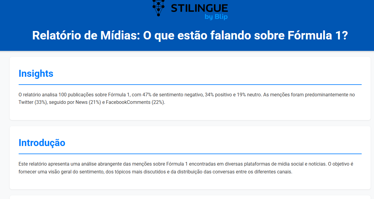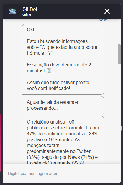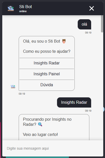 Assistente Sti Bot 7 de abril de 2026 19:22 Atualizado O que é o Sti Bot? Como usar O que o assistente considera para geração de Insights O que é retornado na geração de um insight? O que é o Sti Bot?⚠️Esta funcionalidade está em Beta Testing, ou seja, não está disponível para todos os clientes. Como toda funcionalidade em Beta Testing, ela deverá passar por ajustes e refinamentos. A versão que você estiver utilizando no momento pode conter elementos diferentes do que está documentadoO Sti Bot é um assistente que permite, de forma conversacional, a: Gerar insights tanto de mar aberto (Radar) quanto do painel que o usuário está acessando no momento Fazer perguntas sobre o funcionamento da plataforma em linguagem natural Agilizar análises em poucas palavras Como usar1. Acesse o Warroom e clique no ícone de conversa no canto inferior direito da página2. Abra o AssistenteAo clicar no ícone de conversa você verá o ícone do assistente3. Ao clicar no ícone, a janela do assistente carregará. Basta digitar qualquer coisa para iniciar o fluxo do assistente. Ao iniciar, ele dará 3 opções: Insights Radar Insights Painel Dúvida 4. Escolha a opção que você deseja utilizar, siga as instruções da conversa e aguarde a resposta5. Continue a conversaVocê pode: Refinar perguntas Pedir mais detalhes Explorar novos temas O que o assistente considera para geração de InsightsPara os insights do painel do usuário, o assistente considera as últimas 800 publicações coletadas e adicionadas no painel. São consideradas todas as interações de todas as redes sociais,Para insights do Radar, ele busca as últimas 800 publicações com a pesquisa digitada. São consideradas todas as interações de todas as redes sociais. O que é retornado na geração de um insight?Ao pedir por um insight, o assistente retornará uma análise em texto dentro da própria conversa, e um report em html com mais detalhes. Resposta na conversaRelatórioLimitações importantes O assistente considera apenas os dados disponíveis no momento Pode haver variações dependendo da qualidade e volume das publicações Respostas são baseadas em interpretação automática Boas práticasPara melhores resultados: Faça perguntas específicas Evite perguntas muito amplas Use termos relacionados ao conteúdo exibido Para mais informações, acesse a discussão sobre o assunto em nossa comunidade ou os vídeos no nosso canal. 😃