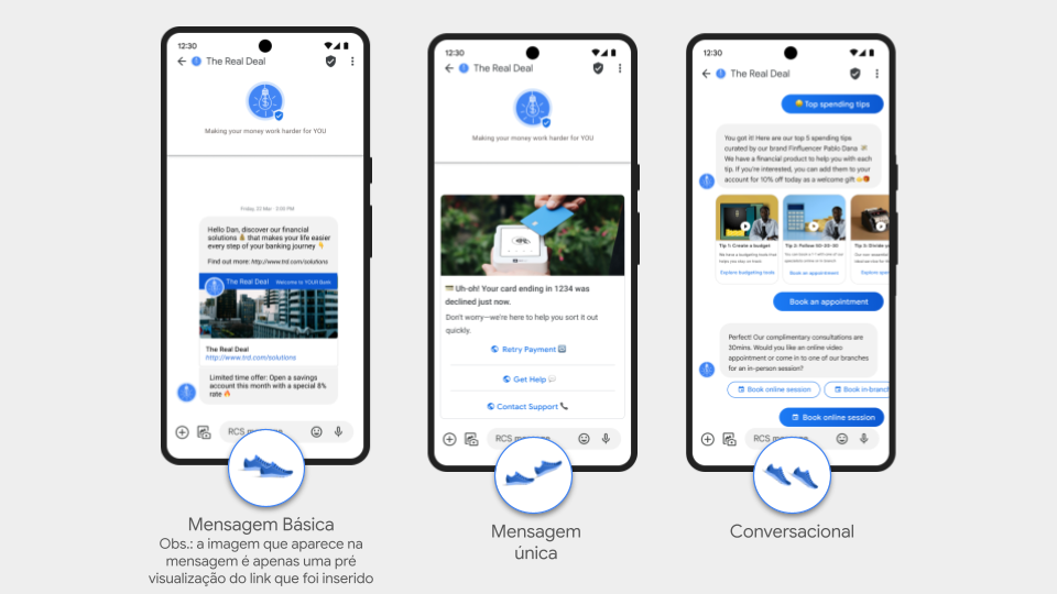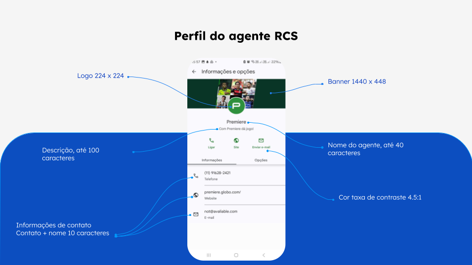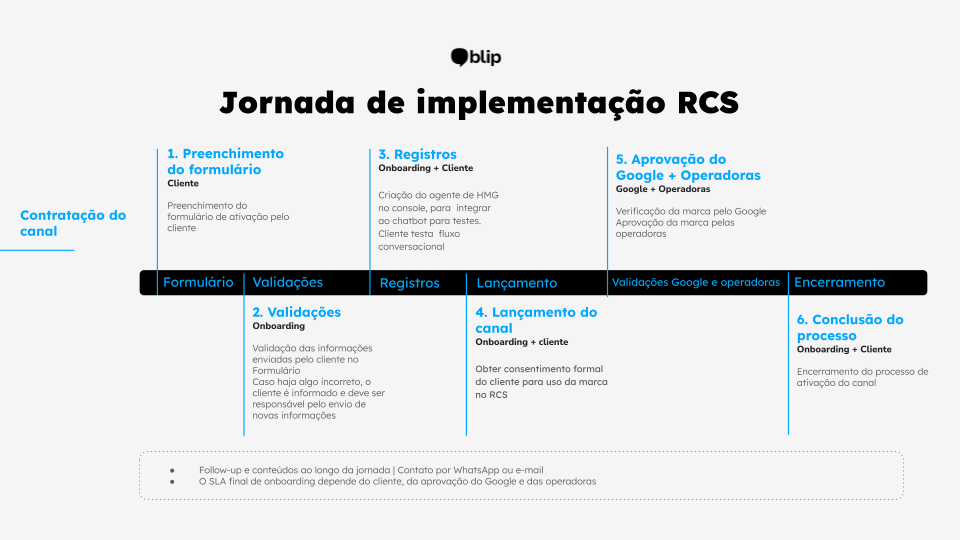 Como preencher o formulário de ativação do RCS no Blip 15 de abril de 2026 14:35 Atualizado Introdução Antes de começar Passo a passo para preenchimento do formulário Procedimento de Coleta de Opt-in Próximos Passos IntroduçãoO RCS (Rich Communication Services) representa a evolução do SMS tradicional, permitindo uma comunicação empresarial através do aplicativo Google Mensagens (padrão Android e disponível em operadoras selecionadas no iOS). No ambiente corporativo, este canal é denominado RBM (RCS Business Messaging).Diferente do SMS, o RCS oferece recursos avançados como identificação oficial da marca, envio de mídias ricas (imagens, banners, carrosséis), botões interativos e métricas detalhadas de entrega e leitura em um ambiente verificado pelo Google.SMS X RCS Antes de começarPara prosseguir com a ativação do canal RCS, é obrigatório que sua empresa possua: Política de Privacidade: Publicada e ativa no site oficial. Termos de Uso: Publicados e acessíveis no site oficial. Fluxo de Opt-out: O contato inteligente deve prever uma opção de saída clara para o usuário (ex: "Digite SAIR"). Passo a passo para preenchimento do formulárioO processo de ativação do RCS tem as seguintes etapas:O preenchimento deste formulário é a etapa inicial para a criação do seu agente. Siga as orientações detalhadas para cada seção abaixo:1. Identificação e ResponsáveisNestas seções, definimos quem operará o processo de ativação. E-mail do solicitante: Informe obrigatoriamente um e-mail corporativo válido. Evite e-mails pessoais para não atrasar o processo. Responsáveis pela ativação: Liste o nome, sobrenome e e-mail corporativo das pessoas que acompanharão o projeto, aprovarão materiais e tomarão decisões sobre o canal. Exemplo: Maria Silva (Gerente de Marketing) – maria@empresa.com.br. 2. Categoria de Faturamento O modelo de cobrança é definido pelo Google com base na interação: Categoria Indicado para Modelo de Cobrança Exemplos Preço cobrado Observação Conversacional Atendimento, Suporte, SAC e fluxos interativos. Por conversa (janela de 24h). Consultar produtos ou resolver problemas. Conversa iniciada pela marca: R$ 0,266 Conversa iniciada pelo usuário: R$ 0,10 Por Conversa: Taxa fixa por 24h com mensagens ilimitadas após interação mútua. Mensagem Avulsa: Cobrança individual por disparo quando não há resposta em 24h. Não conversacional Disparos informativos, notificações e alertas. Por mensagem entregue. OTPs, alertas de entrega e ofertas. Mensagem básica: R$ 0,078Mensagem única: R$ 0,11 Faturamento por mensagem individual (custo unitário por interação). Diferenças entre os Tipos de Mensagem Mensagem Básica: Conteúdo exclusivamente textual com até 160 caracteres. Permite a inclusão de URLs, desde que o limite total não seja excedido. Mensagem Única: Mensagens de texto que ultrapassem 160 caracteres ou que utilizem recursos avançados, como imagens, carrosséis, botões e anexos. Qual escolher?Se o usuário vai responder → ConversacionalSe é envio informativo → Não conversacionalSe a sua estratégia envolve tanto campanhas conversacionais quanto informativas, a recomendação técnica é a criação de dois agentes distintos em bots separados. Isso permite segmentar o faturamento de cada um e evita custos inesperados.Importante: Caso opte pelo cenário híbrido, informe ao seu analista de onboarding durante o processo de ativação. Em caso de dúvidas, consulte nossa equipe especializada antes de confirmar a configuração. 3. Pontos de Entrada e Casos de UsoDefina como o cliente encontrará sua marca (exclusivo para categoria Conversacional): Link Direto: URL para uso em sites, e-mails, apps ou QR Codes. Busca Orgânica Google: Exibição de botão de mensagem diretamente nos resultados de busca do Google. É possível selecionar ambas as opções. Abaixo, há um exemplo de como o botão de mensagem é exibido na pesquisa orgânica:Categorias de Caso de Uso:Selecione uma opção: OTP: Códigos de verificação e logins. Transacional: Status de pedido, confirmação de compra ou alertas bancários. Promocional: Campanhas de marketing, ofertas e lançamentos. 4. Configurações Técnicas e Visuais ID do Chatbot: Localize em Configurações > Informações do Bot na plataforma Blip. Certifique-se de que o fluxo é compatível com os elementos de interface do RCS. Nome do Agente: Utilize o nome oficial da marca. Evite emojis, slogans ou frases promocionais (ex: "Loja ABC Oficial"). Descrição: Breve resumo dos serviços oferecidos no canal. Cor da Marca: Informe o código hexadecimal para os botões. O Google restringe a escolha a uma paleta específica. Ativos Visuais (URLs Públicas): Banner: 1440 x 448 px (até 10MB). Logo: 224 x 224 px (até 10MB). Nota: Você pode usar a extensão File Uploader do Blip para gerar essas URLs. 5. Contatos e LegalInforme os dados oficiais que aparecerão no perfil da marca: Telefone de Contato: Formato +55 (DDD) Número. Site e E-mail: Devem ser os canais oficiais de atendimento da empresa. Políticas e Termos (Obrigatório): Devem estar hospedados no site, ser públicos (sem necessidade de login) e as URLs devem estar ativas. Não envie PDFs internos. 6. Homologação e TestesConcluída a criação, o agente passará por uma fase de homologação. Durante esta etapa, você poderá validar o fluxo de mensagens e realizar ajustes finais no perfil (como foto e descrição) antes da ativação definitiva;Informe números de telefone para teste no formato +DDI + DDD + número (9 dígitos). Requisitos para teste: Aparelho com Android ou iOS (atualmente apenas operadoras Vivo e TIM suportam RCS no iOS), app Google Mensagens ativo e RCS habilitado nas configurações do aparelho. Procedimento de Coleta de Opt-in Descreva o método utilizado para obter a autorização do usuário para o recebimento de mensagens. Este consentimento pode ocorrer de diversas formas, como: Portal/