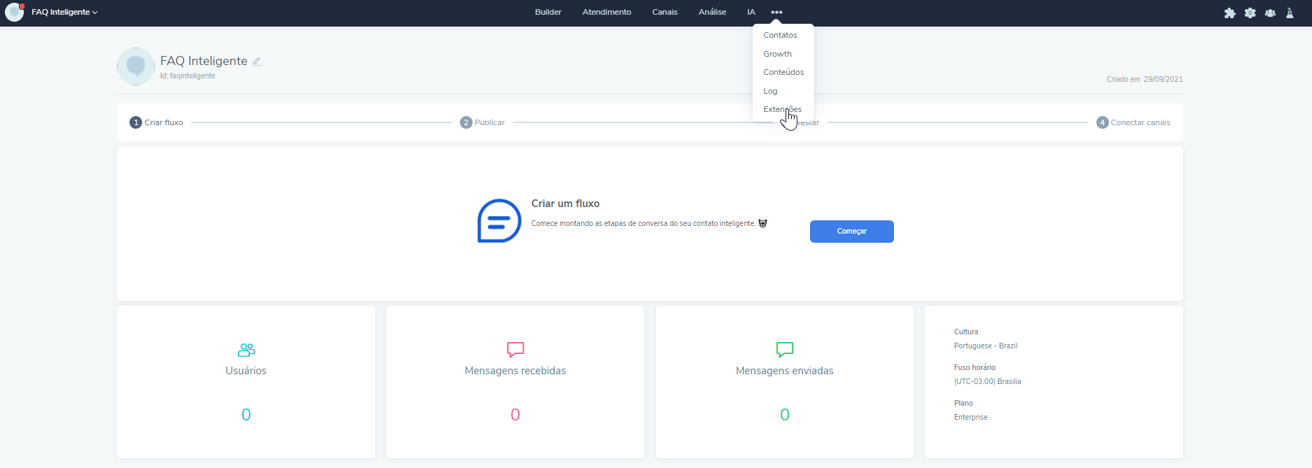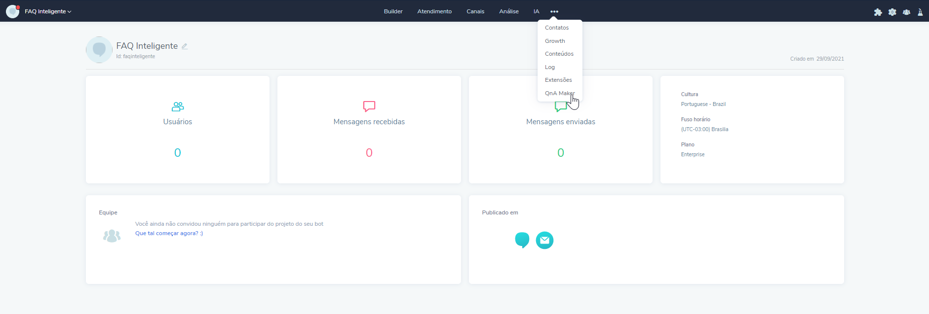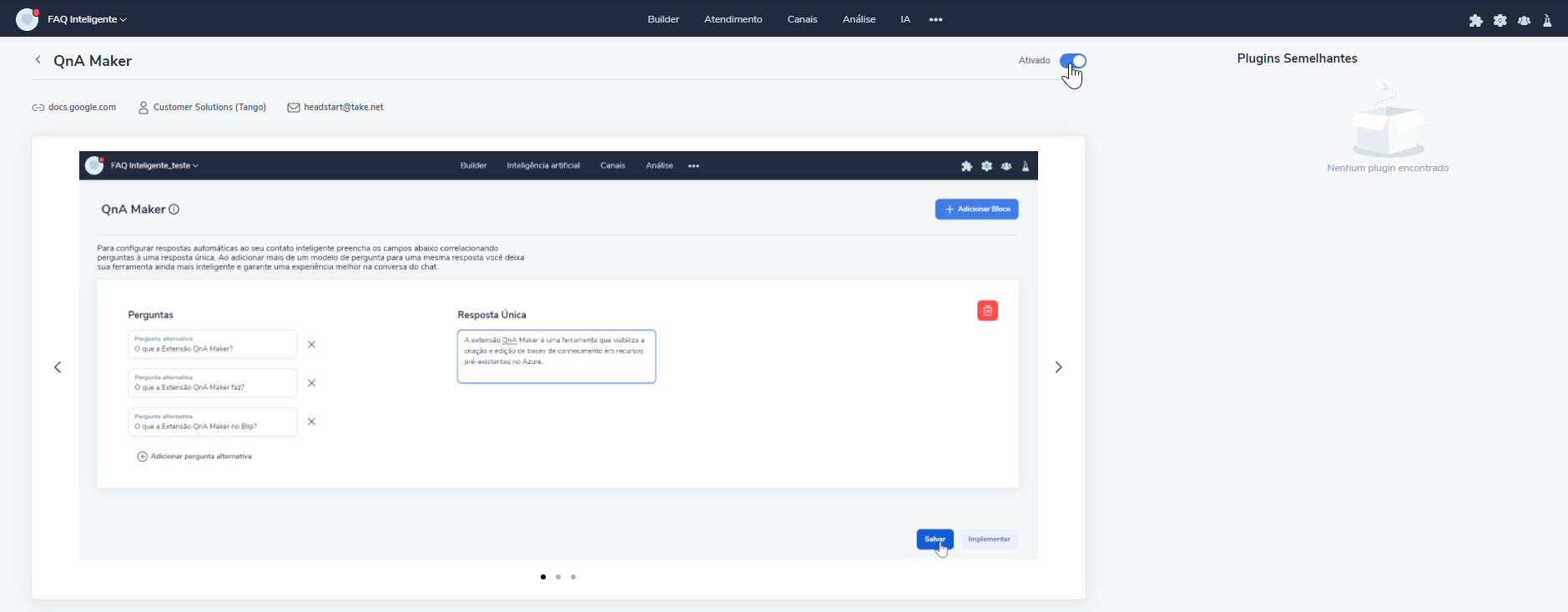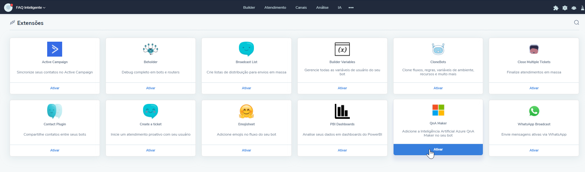 Comece por aqui: Como ativar a extensão QnA Maker 18 de julho de 2024 15:00 Atualizado Extensão QnA Maker é uma ferramenta que possibilita conectar o seu contato inteligente à Inteligência Artificial QnA Maker (Microsoft), um serviço de NLP (processamento de linguagem natural) baseado em nuvem que permite criar uma camada de conversa natural sobre seus dados.Ao ativar esta extensão, o usuário poderá acessar pelo Blip bases de conhecimento próprias já existentes ou criar novas bases de conhecimento em seus próprios recursos na Microsoft Azure. A partir desta configuração inicial é possível criar, editar e excluir perguntas e respostas sem limites de quantidade, criando assim uma base de conhecimento extensa que será, em seguida, conectada ao bot e utilizada para responder às perguntas dos usuários. Para utilizar a Extensão QnA Maker basta você selecionar o bot que deseja e abrir a área de extensões no menu central: Em seguida clique em “Ativar” na Extensão QnA Maker: Por fim opte por “Ativado” no canto superior do título da extensão: Pronto! Agora é só atualizar a página e a Extensão QnA MAker aparecerá no menu central, como submenu em , como demonstrado na imagem abaixo: Para o passo seguinte, configuração inicial da Extensão QnA Maker, confira este artigo. Atenção! A Extensão QnA Maker não deve ser ativada em Bots do tipo Roteador. Você verá aqui que, para finalizar a conexão entre bot e QnA Maker, é necessário fazer a requisição HTTP no builder do bot. Porém, o Bot Roteador não tem builder, logo esta conexão não é viável. Portanto, a extensão deve ser ativada sempre em Bot do tipo Builder. Para mais informações, acesse a discussão sobre o assunto em nossa comunidade ou os vídeos no nosso canal. 😃 Artigos relacionados Continue aqui: Como configurar o QnA Maker Como criar um bot com o Builder do Blip Mensagens Ativas - Códigos de erro Criando mensagens interativas no WhatsApp Como configurar um bloco de destino por variável